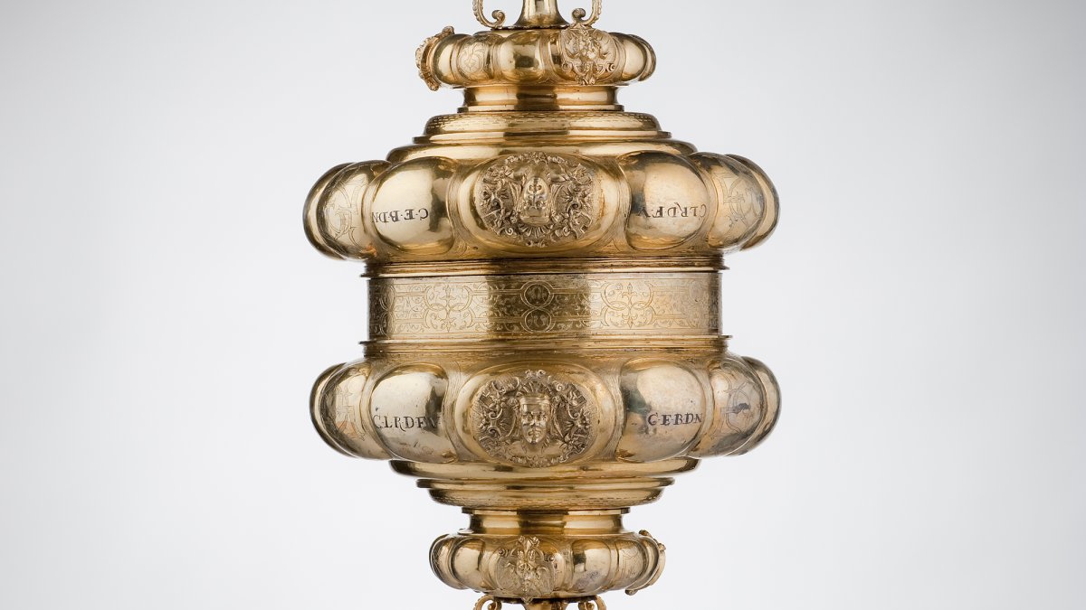 This piece consists of two cups joined together. Many cups of this kind were wedding gifts and were used at banquets – an indication of the owners’ high status. Each cup has a lobed convex bowl, a frieze running round the rim, and a foot, all profusely decorated. This model was developed in Nuremberg and Augsburg around the mid-16th century. The engraved lobes alternate with chased female faces, a typical German decoration of the second half of the sixteenth century. The cup was acquired by Baron Heinrich Thyssen-Bornemisza before 1930 and bequeathed to his son Hans Heinrich.