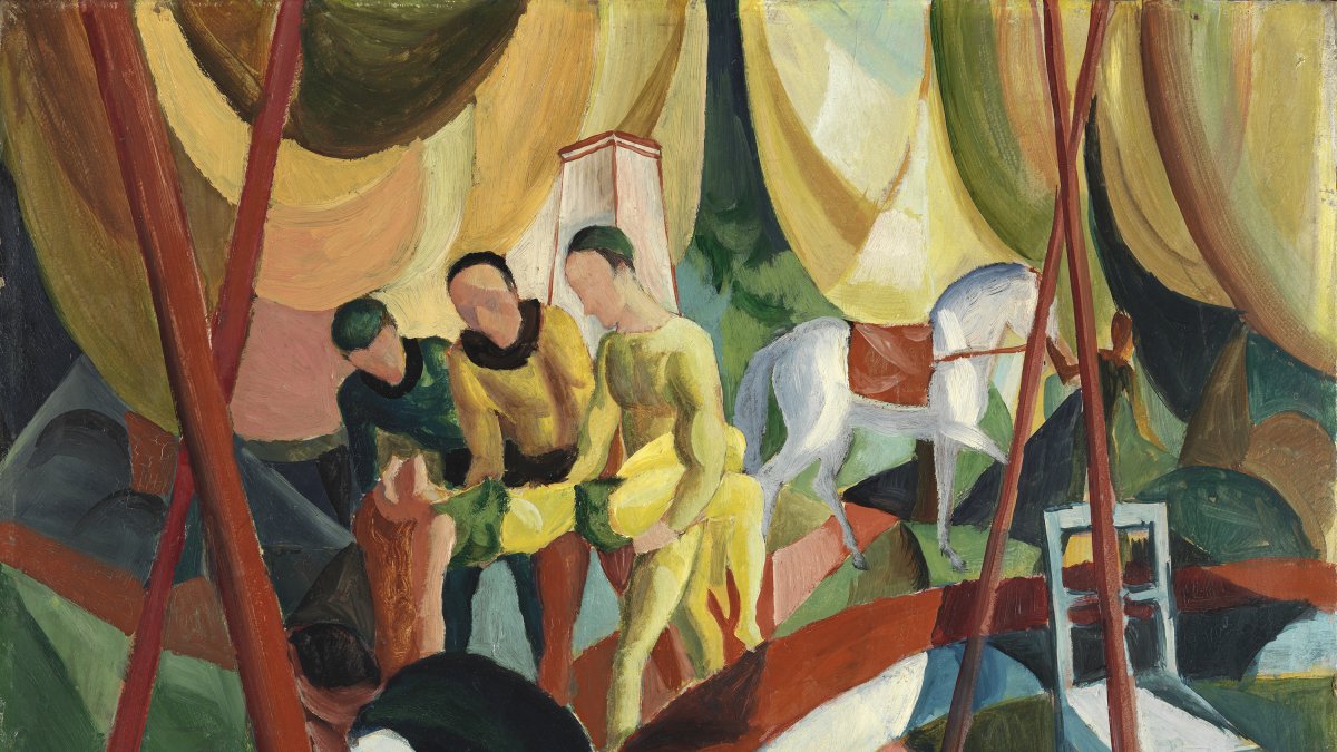 En esta pintura y en El equilibrista, dos obras estrechamente relacionadas entre sí, Macke rescata el tema del circo. Este espectáculo había interesado con anterioridad a otros muchos artistas por su colorido, su luminosidad y, quizás también, por tratarse de un mundo a contracorriente de las normas establecidas. Los factores que motivaron el interés de Macke por los contenidos circenses durante el invierno de 1913-1914 podrían estar relacionados —según apunta Peter Vergo —con su traslado a Hilterfingen en Suiza, a orillas del lago Thun. Allí, según testimonio de Elisabeth Macke, solía actuar en la plaza del mercado una familia de artistas llamados Knie, cuyas piruetas sobre un cable colocado en la plaza les habían impresionado tanto a ella como a su marido: «Es un inusual espectáculo de rico colorido y extraños contrastes que uno raramente puede contemplar. Todo esto le causó una gran impresión estética a August, quien trasladó estas experiencias con una gran maestría en numerosos dibujos y pinturas».