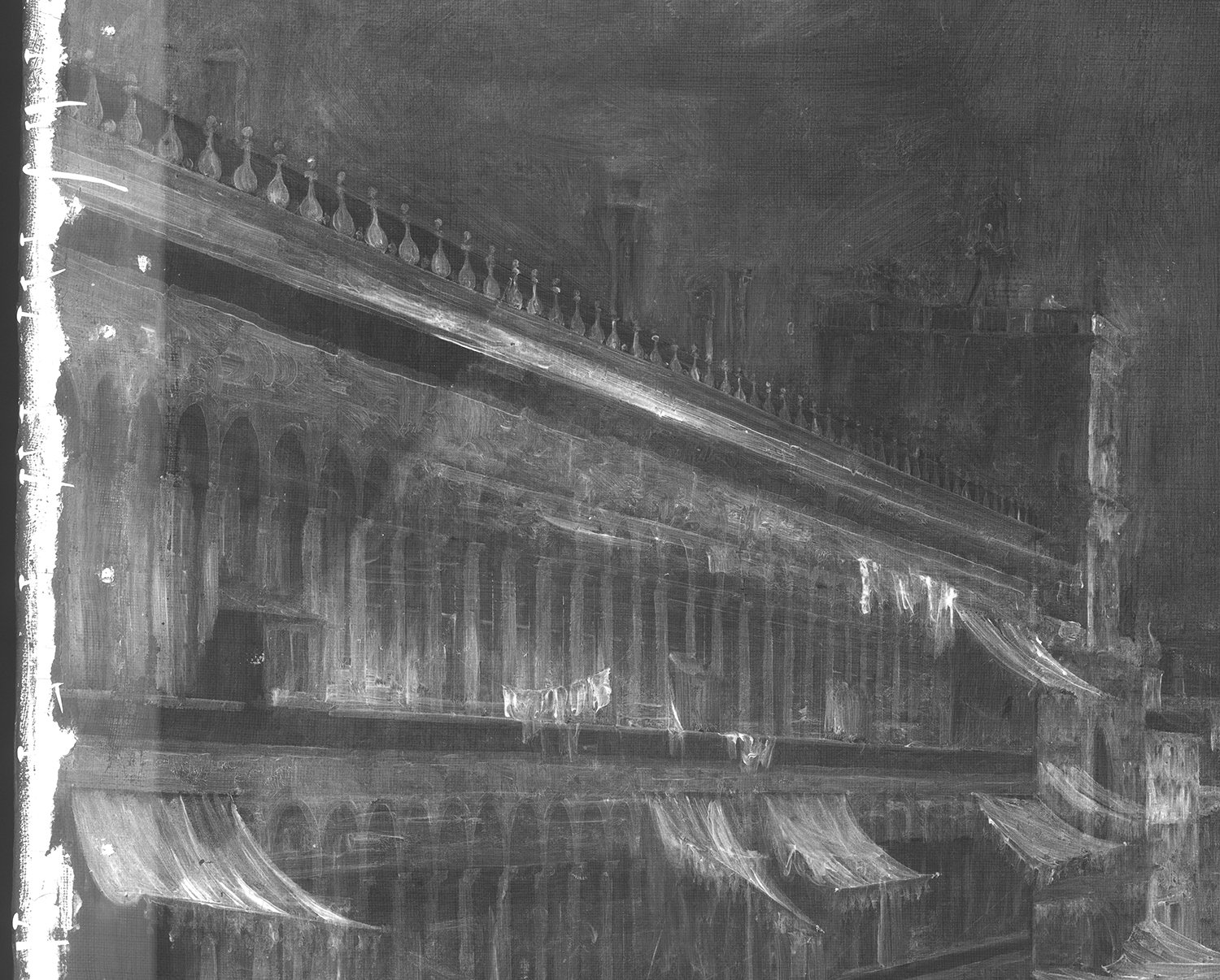 For example, X-radiography shows that Canaletto decided to conceal part of this washing beneath the last layers of paint. However, this was not the only change he made. He also altered the chimney, varying its proportions to integrate it better into the overall composition, and modified the lighting of the façade, which was somewhat more sombre in the initial design.