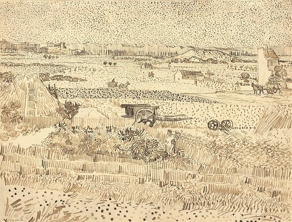 On his long walks in search of life outside the urban centre, Van Gogh painted the wetlands of the Camargue, the ghostly Montmajour Abbey rising above the plain of La Crau, and the vast fields around Arles, where he depicted wheat farmers and harvesters hard at work.