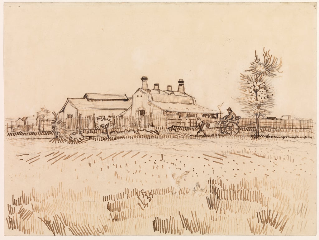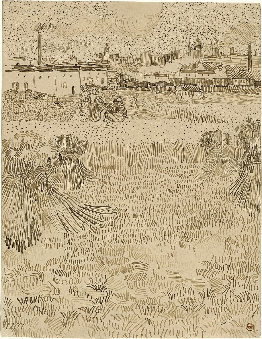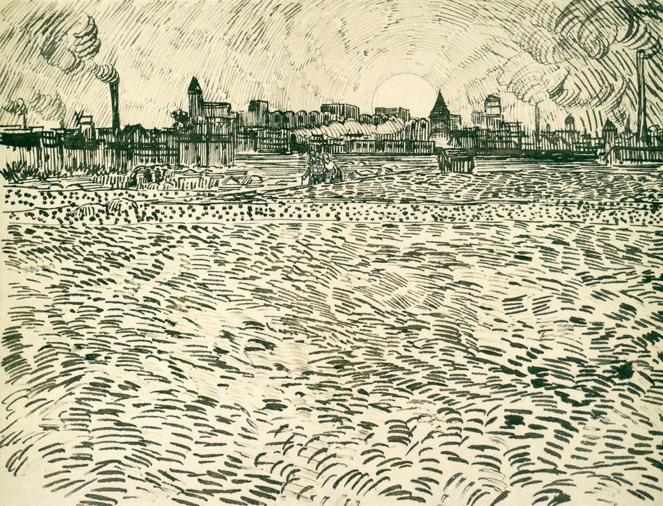 At Arles, Van Gogh was drawn to existence on the periphery, in the transitional spaces between city and non-city. The artist turned his eye to the suburbs and away from the imposing city filled with Roman ruins or medieval monuments. He painted outdoors and hiked along the banks and canals of the Rhone, seeking paths and bridges where life unfolded far from the urban centre. His sketches and drawings captured those outskirts.